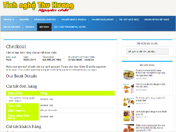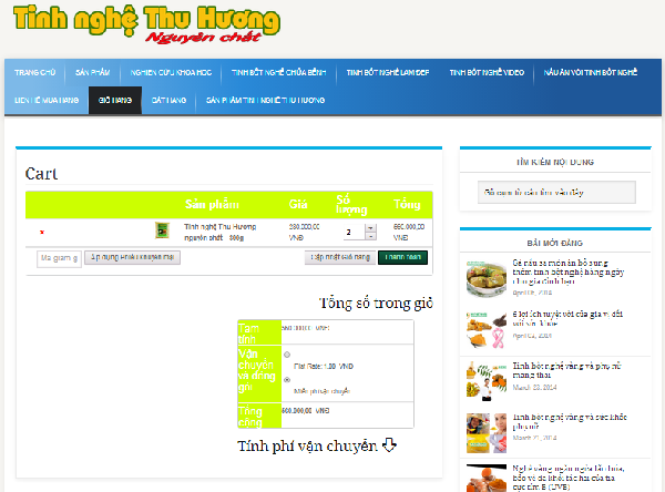Hãy xem video hướng dẫn mua hàng trực tuyến ở đây: Tóm tắt các bước đặt hàng trực tuyến, bạn làm theo như sau:Bước 1: Kích vào thẻ “SẢN PHẨM TINH NGHỆ THU HƯƠNG” để xem hàng. Kích vào các mặt hàng để xem thông tin chi tiết.